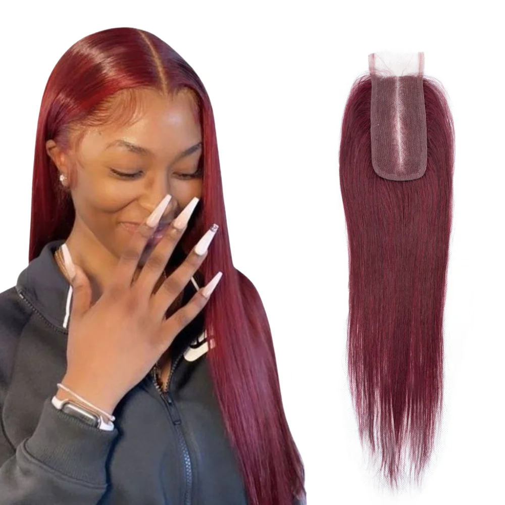 Name: Sapphire-extensiones de pelo humano Color vino tinto 99J, accesorio capilar liso con cierre de encaje de 2x4 nudos blanqueados, 2x4, 8 a 20 pulgadas